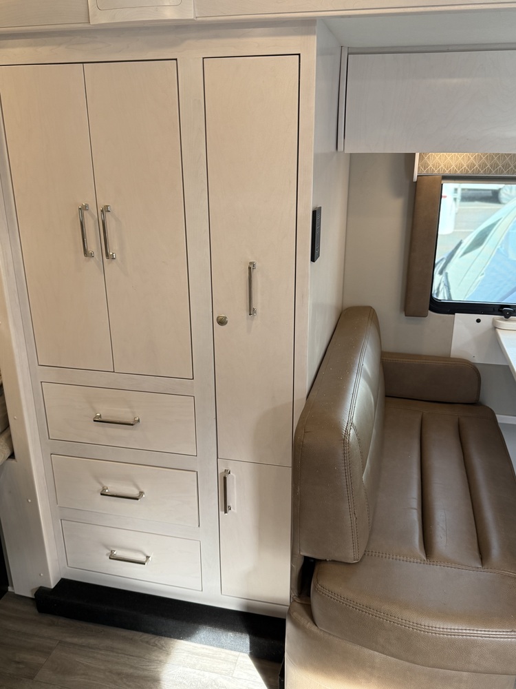The exterior of the vehicle is sleek and modern. The Mercedes engine and chassis ensures a smooth and reliable ride, while the advanced technology features make driving this motorhome a breeze. At purchase we upgraded to the enhanced Lithium battery, single burner induction cooktop and diamond shield anti-chip protection front mask. We have replaced the original fuel tank with a 45 gallon fuel tank, added a Trailmaster tow package and an additional solar panel to charge the chassis batteries.