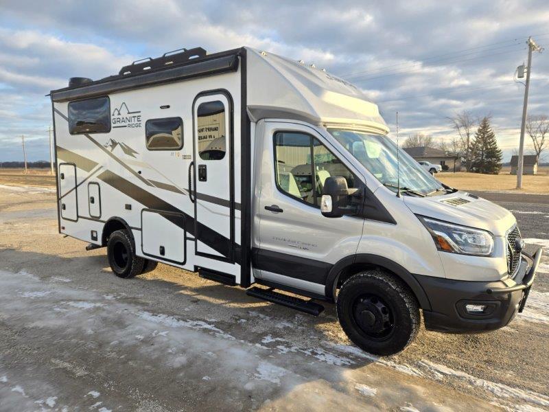 (USED) 2024 Jayco Granite Ridge 22T, 22’11”, No Slides, 3.5L EcoBoost, Ford Transit 350HD AWD Chassis, J-Ride: Computer Balanced Driveshaft, Heavy Duty Rear Stabilizer Bar, Standard Front Stabilizer Bar, Hellwig Helper Springs & Rubber Isolation Body Mounts, Van Compass Front & Rear Lift Kit, 2800 Watt Onan Gas Generator w/ Auto Gen Start, 2,000 Watt Inverer, 360 Watt Roof Mounted Solar Panel, 3.9kWh 12V Lithium Battery, PS, Dash Air, Adaptive Cruise Control, Tilt, Power & Heated Mirrors, 4 Way Swivel Driver & Passenger Seats, 12” SYNC 4 HD/NAV/IACC Multi Function Display, Back-Up Camera, Lane Keeping System, Forward Collision Warning, Pre-Collision Assist, Hill Start Assist, TPMS, All Terrain Tires, Matte Black Aluminum Wheels, Fiberglass Roof, Roof Rack, Outside Shower, Heated Garage w/ L-Track, 6 Gallon LP Tank, 13,500 BTU AC Unit, Aqua Hot 125G Hydronic Water & Heating System, Firefly Multiplex System, Cassette Screens & Night Shades, Flat Screen TV, Winegard Connect 2.0 4G/WiFi/Digital TV Antenna, Induction Cooktop, Convection Microwave, 5.3 Cu. Ft. 12V Fridge, Sink, Dinette Lounge, Adjustable Table w/ Multiple Mounts, All-in-One Wet Bath w/ Shower & Cassette Toilet, Powered Roof Vent, 2) Twin Size Beds w/ Filler Cushion – Converts To King Size Bed, Sleeps 4, Power Patio Awning, w/ Auto-Retract & LED Lighting, Beige Interior, Light Wood, Grey Exterior