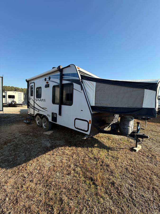 2015 Palomino SolAire 163X. This SolAire hybrid is everything you need and more to enjoy camping with family and friends. Model 163X features front and rear queen expanding tent end beds, fold down couch and fold down booth dinette and sleeps 6 adults comfortably. As you enter there is a double kitchen sink to your right with overhead cabinet and microwave oven, a three burner range, and 42" x 69" booth dinette. Above the dinette there is an overhead storage cabinet and LED TV. Straight in from the door there is a complete bath with toilet, vanity with sink, and step tub. Next to the bath is a refrigerator for perishables, a wardrobe, and sofa sleeper with overhead cabinets. The front and rear both features 60" x 80" tent end beds for comfortable sleeping, and so much more!