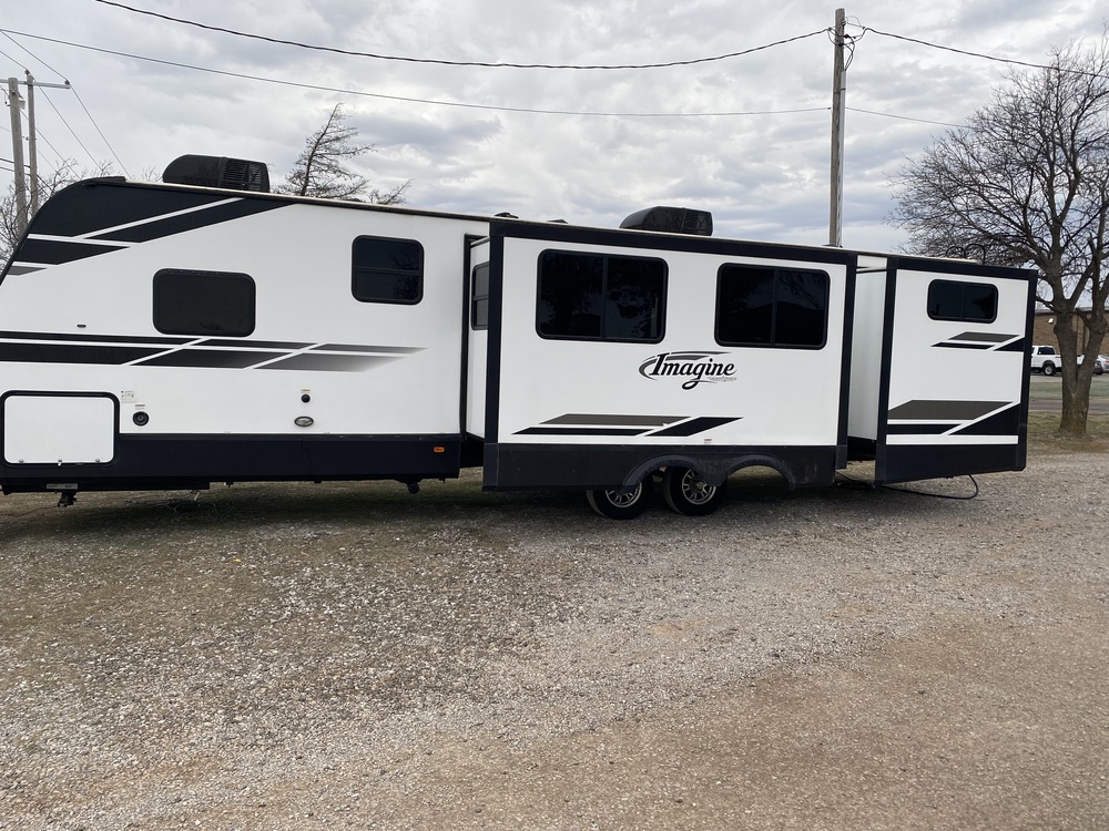 This Imagine 3170BH dual-entry travel trailer is perfect for a family of 9. There is bedding for 5, plus 4 if you fold down the u-shaped dinette with a removable ottoman, sofa, and bunkhouse sofa. The kiddos will have to draw straws for the three bunk beds. The cook in the family has the choice to cook inside, or outdoors on the outside kitchen. You can even bring your pets along to enjoy the pet dish drawer. There is a 32" LED TV with a swing arm, a walk-through bath, and much more to enjoy with your whole family! Now imagine you own this trailer and what fun you will have! The oversized tank capacities will allow you to stay a little longer when full hook-ups aren't a choice. Some of the inside features include upgraded residential furniture, large panoramic windows, and a Bluetooth stereo.