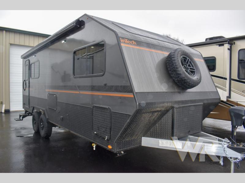 The O-R-V travel trailers and toy hauler by inTech RV allow you to experience adventure off the beaten path with its rugged exterior and lightweight construction provided by the all-aluminum fully welded cage frame. The power tongue jack will make setting up camp a breeze, plus there is a fold-away double entry step and exterior lighting for added convenience. Inside, you'll find a large farmhouse style sink, a MaxxAir vent for ventilation, plus infinity woven flooring. There is a Bluetooth stereo with four speakers and a 32" Smart TV included with each model, plus USB and 110V outlets to keep your electronics charged and ready to go. Further customize your O-V-R by adding the optional power awning or the optional Off-Grid Package with 400 watts of solar power, 20 amp hours of lithium batteries, and a 2,000 watt inverter!