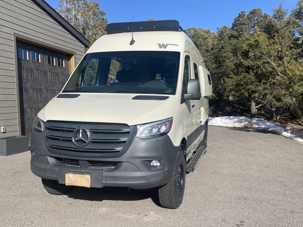 Twenty-one gallon fresh-water tank; 200-watt solar power system; 30-amp shore power cord for campground hook-up. Three new AMG batteries and 2,000-watt inverter. Fully equipped galley with a refrigerator/freezer, induction cooktop, and sink. Cassette toilet and shower. Rixen Espar heating system, Coleman Mach air conditioner, and Maxxair fan. Ample storage space for bikes and other toys under power-lift electric bed. Electric awning. Fold-down tables inside and outside.