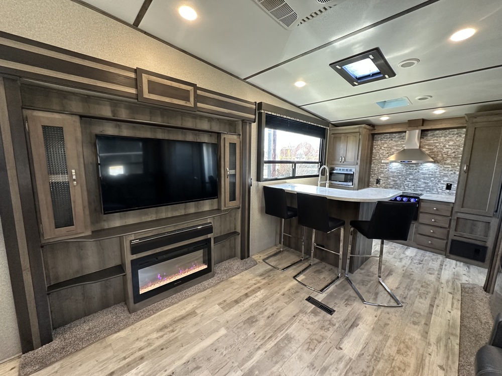 This Keystone Sprinter is the perfect fifth wheel for several reasons. Model 3551FWMLS offers a kitchen bar with 3 stools and a residential refrigerator for starters. There is a 55" HDTV and a fireplace centrally located for everyone in the kitchen and living area to enjoy. You will find four slide outs throughout providing additional floor space for all to move about without having to squeeze in. There is a residential shower with a seat just like home, and the front bedroom includes a closet that has been prepped for a washer and dryer if you choose to add those convenient appliances. You will also find plenty of storage inside as well as outside for all your camping gear. Outside you can cook on the outdoor kitchen!