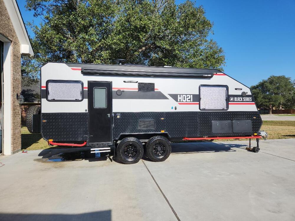 One owner 2022 Black Series HQ21 bought from Blue Compass RV in Austin. Have been on 4 outings with 2 to North Padre Island, one to Galveston Island SP, and one to the Guadalupe river at New Braunfels. Just replaced all 4 tires with brand new Rocky Mountain AT's and 2 new spare tires as well. I've also recently replaced the factory poly hitch with a Cruisemaster DO35 hitch and just installed a Blue Ox weight distribution hitch that I have yet to use. Still have the poly hitch and will include it with the sale as well as a TPMS digital sensor kit I purchased to monitor tire pressure and temperature. There also is a remaining RV Complete service contract that I paid $8000 for that covers RV service, tires and wheels, paint, and roadside assistance that runs through June of 2028. As you can see it has been shop kept at all times and out of the elements. Paid off, title in hand.