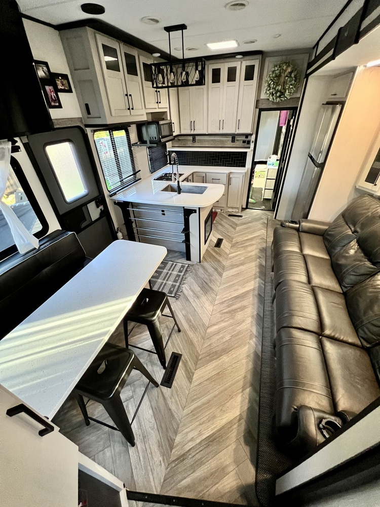 Inside, you'll find a well-appointed living space that feels more like a luxury hotel room than an RV. has ample storage space, and a large countertop for preparing meals. The living area is perfect for relaxing after a long day of outdoor activities, with comfortable seating and unlike most toy haulers it has a 4 person table located in the living area as well as in the garage The bedroom features a comfortable bed and plenty of storage for all your belongings.