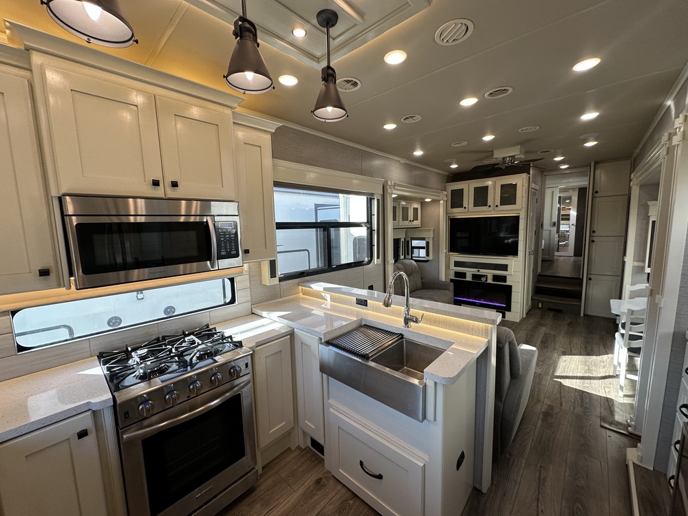 This 5th wheel came with 3 A/C units, gas furnace, on demand tankless water heater and an electric fireplace in the living room and 1 in the bedroom. The fireplaces produce enough heat to take the chill out on the cold mornings.