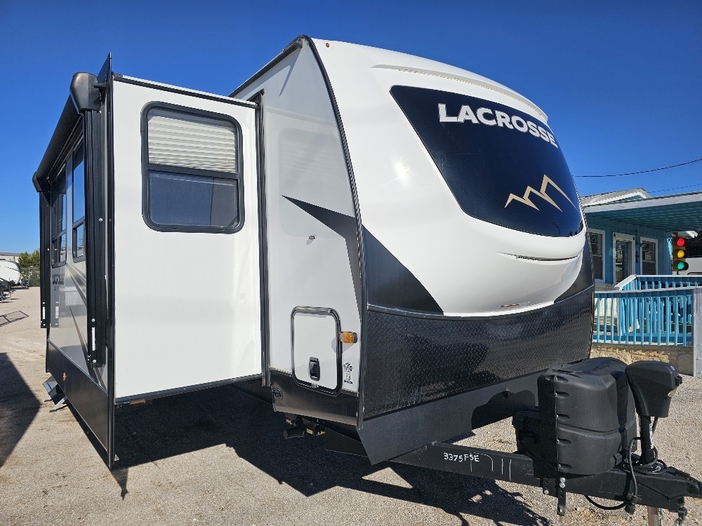 - Also Equipped W/ Power Tongue Jack & Stabilizers. Fiberglass Exterior W/ Aluminum Cage, 2 ACs, Power Awning W/ LEDs, Large TV & Fireplace, Dual Water Heater, Lots of Storage and Much More!