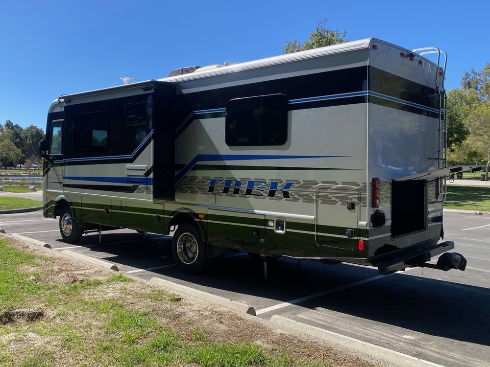 Monaco RV for Sale- 2016 Monaco Trek 26H in excellent condition, with slide and 36,500 miles. This RV is approximately 28 feet 2 inches in length and features a Ford V10 engine, Ford chassis, power privacy shade, power mirrors with heat, 4KW Onan generator, power patio awning, slide-out room topper, water heater, pass-thru storage with side swing baggage doors, black tank rinsing system, water filtration system, power water hose reel, exterior shower, 5K lb. hitch, automatic hydraulic leveling system, 3 camera monitoring system, exterior entertainment center, soft touch ceilings, booth converts to sleeper, black-out shades, microwave, 3 burner range, solid surface counter, sink, glass door shower, cab over loft, 3 flat panel TV's, ducted A/C, solar panels, lithium batteries, road master towing system, winegard wi-fi system, clear-coated full body paint, 6 new premium tires, and much more.