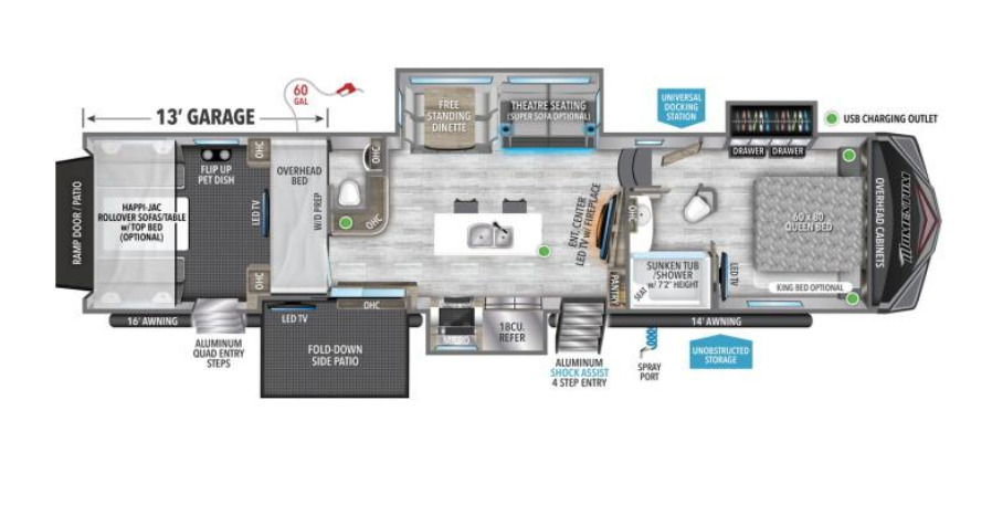 Garage & Toy Hauler Ample space for toys, gear, or an additional living area. Double queen bunk beds with the bottom bunk converting to a table/lounge area.