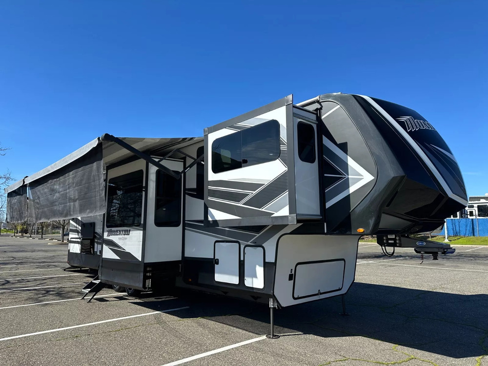 For sale by dealer is a 2022 Grand Design Momentum 376THS Toy hauler fifth-wheel trailer. This trailer is unique, offer full length living space and space for a toy. Rear garage area is 117" deep, 63" wide, 77" tall with electric bed up and 66" tall with the bed down. It is approximately 41 feet long, with 5 slide-outs, a GVWR of 20,000 lbs, a dry weight of 15,900 lbs, Fresh water 115gl, Grey 104gl, 52gl black tank and 30gl fuel station on board. This trailer comes with a 6-point leveling system, three air conditioners, extra large storage in rear with custom pull outs, Led under lighting with color changing option, two awnings with LEDs, washer/dryer combo in kitchen, window shades, real wood interior, solid counter tops, and much more. Inside features a large bedroom area in the rear with a Queen bed. Large full bathroom has a spacious shower with multi jets. In the middle is the kitchen with island, a large double refrigerator, large pantry and a dining table for four that has been converted in to work station. Living area in the front with two sofa beds, two recliners windows, fireplace and hideaway TV. Previous owner has installed a large 1,200 watt, six solar panels with six Battle Born batteries. Please see over 150 pictures on our eBay listing.