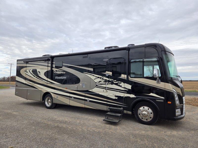 2023 Winnebago Adventurer 35F, 35’5”, Two Slides, 7.3L V8 Ford, Ford Chassis, Electronic Stability Control/Traction Control, SumoSprings Suspension Enhancement, Steering Stabilizer System, 5,500 Watt Onan Gas Generator, Automatic Generator Start System, 115 Watt Roof Mounted Solar Panel, 2,000 Watt Inverter, PS, Dash Air, Cruise, Tilt, Power Mirrors w/ Defrost, Defroster Fans, Power Driver & Passenger Seats w/ Swivel, Heat & Massage, Removable Pedestal Table, Powered Blackout Roller Visor/Shade For Windshield, Sony 9” TS Radio w/ Apple Carplay/Android Auto, Bluetooth & Satellite Radio, Back-Up & Side View Cameras, Automatic Hydraulic Leveling Jacks, Exterior 32” HDTV w/ Speakers, DVD Player & Radio, Full Body Paint, Roof Ladder, Electric Step, Outside Shower, PetPal Leash Tie Down, 2) 13,500 BTU AC Roof Units w/ Heat Kits, 40,000 BTU Furnace, 10 Gallon Gas/Electric Water Heater, Heated Holding Tank Compartment, Winnebago Control w/ 7” Touchscreen Command Center, Solar/Blackout Roller Shades, Dual Pane Frameless Windows, Powered Ventilator Fan, 39” HDTV, USB Ports, Winegard Air 360 Antenna & Gateway 4G LTE WiFi Router, Electric Fireplace, Gas/Induction Range Combo, Microwave/Convection Oven, 2 Door Residential Fridge/Freezer w/ Ice Maker & Water Dispenser, Double Sink, Pantry w/ Baskets, Powered StudioLoft Bed Above Driver Area, Booth Dinette, Extendable Sectional Sofa/Bed, Bath and a Half, Vanity Counter, Shower, Washer/Dryer Prep, 32” HDTV in Bedroom Area, Wardrobe, King Island Bed, Sleeps 8, Powered Patio Awning w/ LED Lighting, Slide Awnings, Organic Comfort Dark Interior (Brown), Weathered Teak & Sonoma Wood, Mojave Dusk Exterior (Black/Tan/Cream), 5,245 Miles