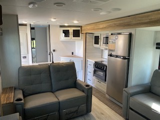 North Trail Ultra Lite is ready for your family of 6! When you enter at the aluminum steps, the kitchen doesnt disappoint. With ample storage, solid surface counter tops and stainless steel sink and appliances youll have all you need and more to keep your family fed! Dual opposing slides in the front living area boasts 2 pullout couches, 2 recliners, electric fireplace and retractable motorized flat screen TV lift. As you move towards the back of the unit, the shotgun style bathroom allows for maximum use of the space with an L-shaped counter, a good size shower and floor to ceiling storage. Lastly, the master bedroom encompasses the back portion of the RV with a gel infused king size mattress and optional corner mounted flat screen TV. Under the bed, accessible from the outside, is a massive 68 cubic foot storage area for all your camping necessities. Any other listing for this same unit range from $34k - $47K! Don't miss this great deal! Rebuilt title due to minor exterior damage to bumper and skirting on right rear which has been repaired. GVW 6,610.