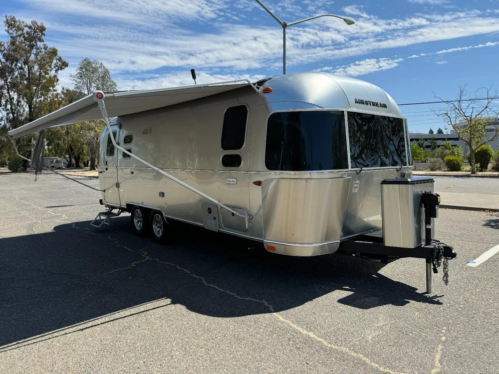 For sale by dealer is 2023 Airstream Flying Cloud 25FB Hatch camping trailer. Trailer is approximately 26 feet long, Dry weight of 5,650 lbs, GVWR of 7,300, 39 gl Fresh water tank, 39 gl grey, and 39 gl black. Inside features front and rear wrap around window, front bedroom with queen bed. Kitchen with sink, stove/oven and microwave, dinette booth also converts into bed. Rear bathroom with separate shower. Trailer also comes with rear hatch that opens up into a patio. Solar panels, inverter, three awnings, tankless water heater, and much more. Please see over 120 pictures on our eBay listing.