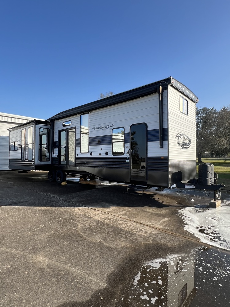 Hello! I bought this RV brand new in 2023 as a temporary place to stay in the big city for work. My wife and I are about to buy a house and do not need the trailer anymore. This Rv is a beast. It has so much storage as you can see in the pictures. I have added many personal touches and shelves in the laundry room and bedroom closet. Here are some things that come with the trailer: