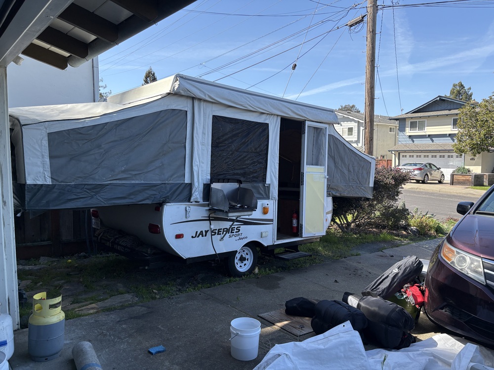 Well maintained pop-up travel trailer. Several owner added upgrades including solar panel, back storage rack and interior shelving. Lightweight and easy to tow. Ready to go for your camping adventures. Camping essentials including portable shower, grill racks, pots/pans, propane heater can be negotiated in sale.