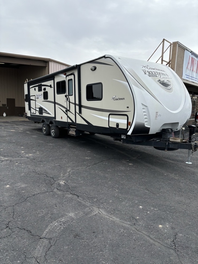 Very nice 2016 Freedom Express 322RLDS. Nice big unit with lots of space with 3 total slides, 2 opposing slides to really open up the living room. This unit has everything you need including dinette that folds into a bed, 2 recliners, rear couch that lays as a bed, center island, lots of windows for natural light, lots of interior storage, fireplace, gas/electric refrigerator, Air conditioning, furnace, pantry, electric stabilizers, power awning, and so much more!