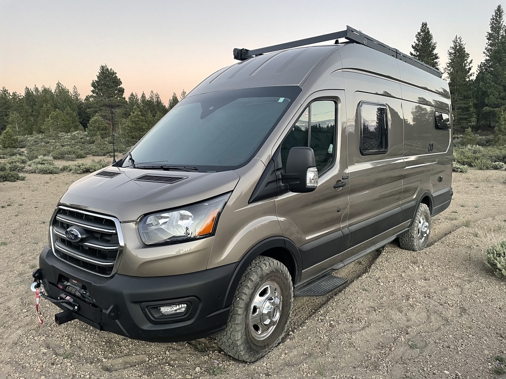 Other notable features include: Roof deck with telescoping access ladder, lagoon table, large bike tray on 500lb sliders, (holds 2 bikes or 1 bike and gear), campsite carpets, insulated window shades for all windows, “Bug Wall” screen system for rear doors and slider, Maxtrax recovery planks mounted on roof deck, Flatline Van Co full roof rack with faring, upgraded speakers, and 3 stage water filter.