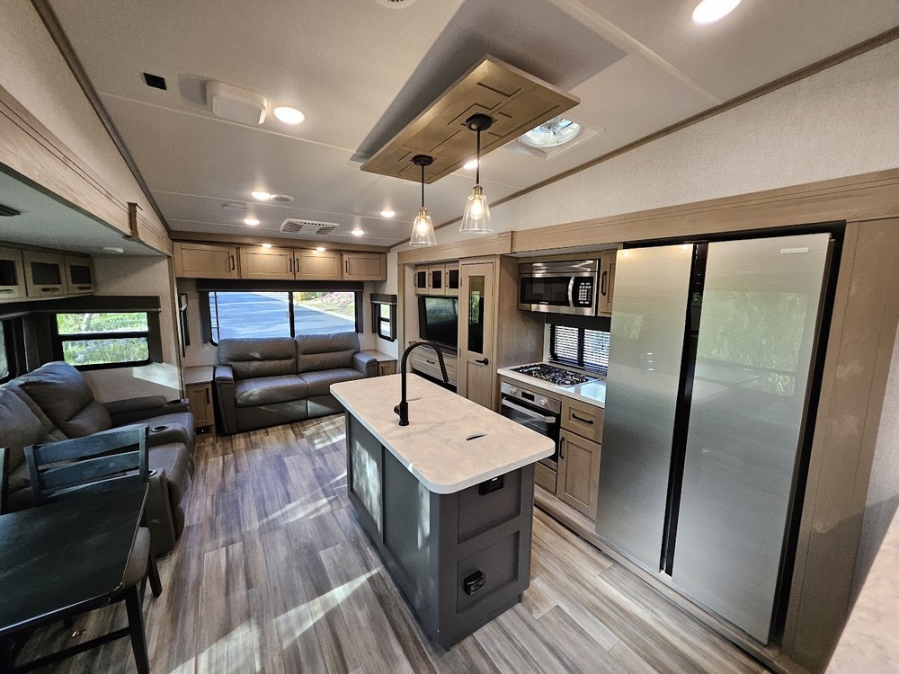 The 2023 Grand Design Reflection 303RLS is a top-of-the-line fifth wheel trailer that is sure to impress even the most discerning of travelers. The Reflection series from Grand Design is known for its luxurious amenities and high-quality construction, and the 303RLS is no exception. The spacious interior features a beautifully appointed living area, complete with comfortable seating, a large kitchen with an island and a 16 cu ft refrigerator. The bedroom has a king size bed and an adjoining bathroom.This model is perfect for couples or small families looking to travel in style and comfort. The 303RLS offers plenty of room for relaxation and entertainment, with features such as a flat-screen TV, theatre recliners with heat and vibration, a fireplace, and sound system. The large windows throughout the trailer let in plenty of natural light and provide stunning views of the surrounding landscapes.The exterior of the Reflection 303RLS is a a sleek design and high-quality materials that are built to last. Overall, the 2023 Grand Design Reflection 303RLS is a fantastic choice for anyone looking for a top-of-the-line fifth wheel trailer that offers luxury, comfort, and style.