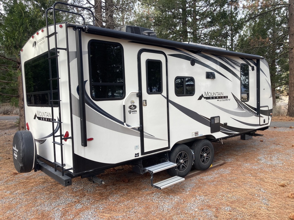Very clean four season trailer. 25' from hitch to ladder, 78 gallons fresh water, 40 each Gray and Black, 60 gallons propane, 200 watts solar, queen bed, three burner range, oven, 30000 BTU furnace, power awning, toilet and shower, power hitch lift, Equalizer anti-sway hitch included. This model has two recliners vs the dinette. Replaced the formica table with a pine slab. Ready to hook up and travel!