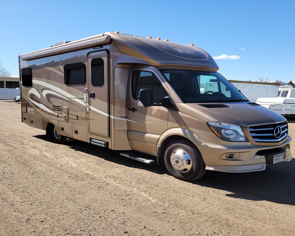 2019 Renegade Vienna 25QRS RV for Sale near Denver. Please Watch Our Video! 2-Slideouts, 3500 Mercedes-Benz Chassis with 3.0-L V-6 DOHC 24V Turbo Diesel Motor with only 17,031 miles, 5-Speed Auto Transmission, 4-Point Auto Leveling System, 3200 Onan Diesel Generator with 24 hrs., 100-Watt Solar Panel, (2) 1-year old House Batteries, 1200-Watt Magnum Inverter, 30-Amp Shore Power, 13,500 BTU Ducted AC with Heat Pump, Michelin LT Tires Size 215/85R/16 DOT 34/21 with Aluminum Wheels, RV Has Always Been Garaged!