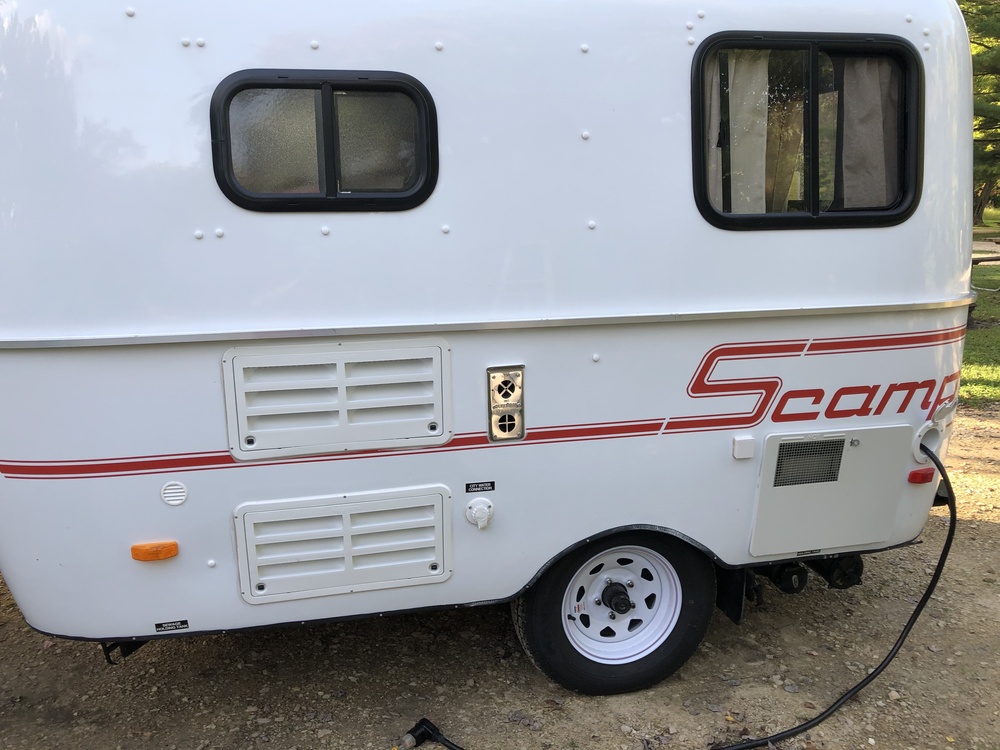 2020 SCAMP 13-foot travel trailer with front wet bath/shower and porcelain toilet for sale in Columbus, Ohio (layout 2). Original owner, Lightweight fiberglass (1,500lbs), Non-Smoking, Super Insulation (R15), Marine Headliner wall fabric and curtains, 3500 pound torsion axle, in-cabin Air Conditioner with Heat Strip, 1.9 Cu Ft 3-way Refrigerator, Sink, 12 volt Water Pump, Two burner Propane Stove, Small optional Window over stove, 16k BTU Furnace with thermostat, 2 extra 12 volt Reading Lights, Roof Fan, back, front and side Fiberglass Cabinets, TV with cable and antenna, gas and electric Water Heater, Silverware Drawer, 30 AMP Power-Converter-Charger, crank out Windows and Screens, Screen Door, front and side Porch Lights, 8-foot Fiamma Awning, Exterior Outlet, Marine Battery, Battery Disconnect, 2 Propane Tanks, 12-gal Fresh Water Tank, 9-gal Gray Water Tank and 9-gal Black Water Tank, hook-up for City Water, 2 Mounted Rear Jacks, second set of Tail Lights, 13-inch Aluminum Wheels, Spare Tire and Spare Tire Cover in rear, Electric Brakes, Custom-fit Trailer Cover. SCAMP Manual, Clear Title, and all other paperwork included.$17,000 reduced from $19,000. Call Deb at 614-323-0449 or email yellowlobster@yahoo.com if you are a serious buyer, only. No dealers.