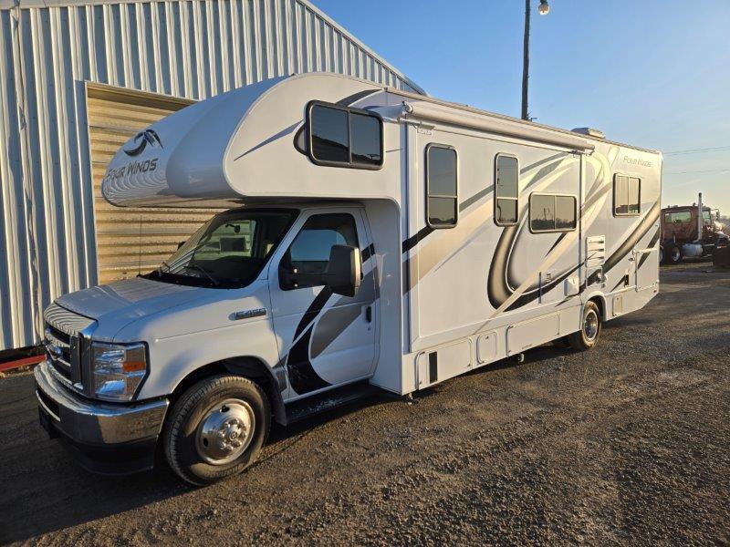 2021 Thor Four Winds 28Z, 29’10”, One Slide, 7.3L V8 Ford, Ford Chassis, 4000 Watt Onan Gas Generator, 100 Watt Solar Panel, PS, Dash Air, Cruise, Tilt, Driver’s Touchscreen Dash Radio w/ Sirius XM, Power & Heated Mirrors, Back-Up Camera & Side View Cameras, Electric Stabilizing System, Exterior 32” TV w/ Bluetooth Soundbar & Radio, Rear Ladder, Outside Shower, 1 Ducted AC Roof Unit, 6 Gallon Gas/Electric Water Heater, Heated Tanks, Monitor Panel, Interior Shades, 39” TV in Living Area, Winegard ConnecT 2.0 4G LTE Router & WiFi Extender, USB Charging Port, 3 Burner Stove, Oven, Microwave, Upper/Lower Fridge & Freezer, Sink, Booth Dinette, Theater Seating, Bed Above Cab Area, Vanity Counter, Shower, 32” TV in Bedroom, Queen Island Bed, Sleeps 6, Patio Awning, Slide Awning, Tan Interior, White Exterior, 10, 521 Miles
