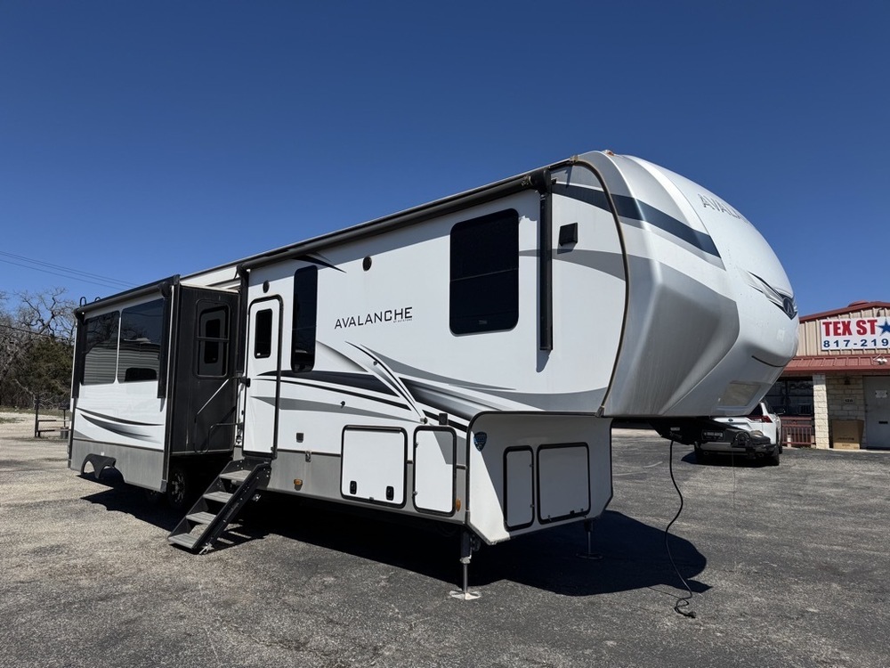 I have a super nice 2022 Keystone Avalanche 390DS for sale. This is a 43ft 2 full bedroom luxury 5th wheel with two full bedrooms, king and queen beds an overhead loft and two full bathrooms that weights around 14,300lbs. This rig is fully equipped. It features two large electric patio awnings, 6 point hydraulic leveling system tinted frameless windows, outside speakers, huge past through storage, 50 amp service and factory solar system. This rig has tons more inside. It features 3 roof top A/C’s, a residential refrigerator, Corain countertops, residential size microwave, free standing table and chairs, heated massaging theater seats, LED TV, fireplace, stereo with outside speakers, overhead loft, a rear lower bedroom with a queen size bed on a slide out , LED TV (not picture and a full rear bathroom with a door accessing it in the rear. Up top it has a second bathroom with a fiberglass shower surround with a seat and a glass enclosure, a private master suite with a king size bed& W/D Rob 817/219/4479