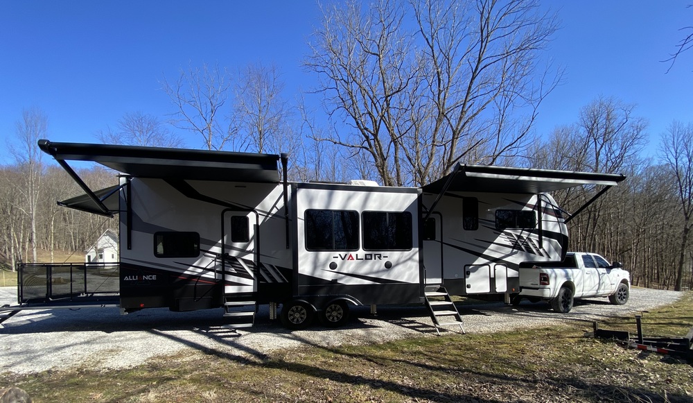 2022 Alliance Valor 36V11 Fifth Wheel Toy Hauler LIKE NEW! Stored in a temperature controlled building. Sleeps 8 people comfortably. Two stacked motorized bunks (never used) inside garage with the bottom converting to table seating. One bunk (never used) between kitchen and garage. 1 1/2 bath. Three motorized bump outs and three motorized awnings. Garage area with tinted glass doors that lead out to covered porch. Railing with gate and steps lead off back porch. Other features include electric fire place, 3 tvs, JBL speakers, fuel and air pump, 3 AC units, solar, 2 washer/dryer hook ups, lots of storage. Garage space never used to haul ATVs/Toys. 1/2 bath never used. Nonsmokers. Length 39’ 8” $75,000 EXCELLENT CONDITION!!