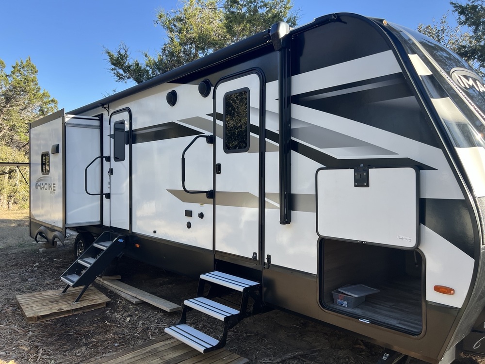 Outside, the Grand Design Imagine boasts a sleek exterior design with stylish graphics and LED lighting. The power awning and outdoor kitchen make it easy to enjoy the great outdoors without sacrificing convenience. With plenty of storage compartments and a durable construction, this travel trailer is built to last through many adventures to come.
