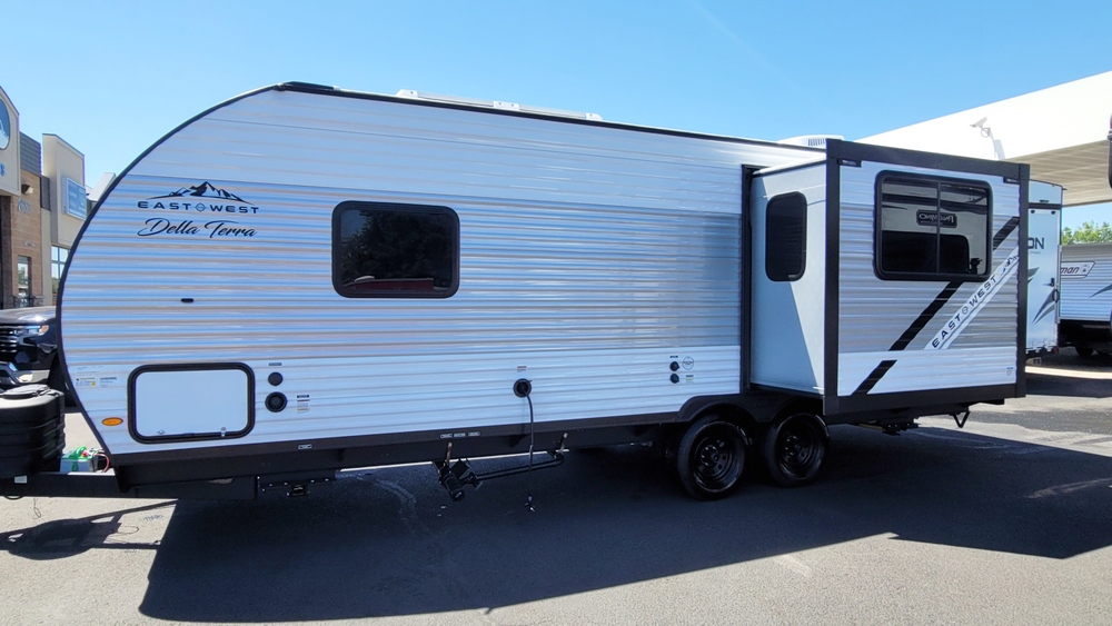 With any Della Terra LE travel trailer by EAST TO WEST, there is USA manufactured furniture, seamless countertops (no T-mold), and a 10.7 cu.ft. frost-free 12 volt refrigerator for your perishables. A Solera power awning with adjustable legs and LED light strip will also provide you with a great outdoor living area protected from both the sun and rain, and the outside hot/cold shower will let you easily wash off hiking gear or fill the dogs water bowl. These trailers also include Furrion back up camera prep, On The Go ladder prep, and slide out awning prep that will allow you to add these features to make your camping experience easier than ever. An optional power tongue jack can also be chosen for easy towing, as well as the optional Solar Package to enjoy some off-grid capabilities!