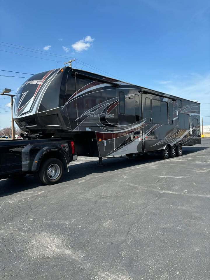 Check out this 2012 Dutchmen Voltage V3900 with beautiful full-body paint! With three slides, it opens up the living area immensely. The kitchen area has a lot of storage including a large pantry, an island, a large refrigerator, a microwave, a three-burner stove with a vented hood, and an oven. The large and cozy dinette doubles as an extra bed.