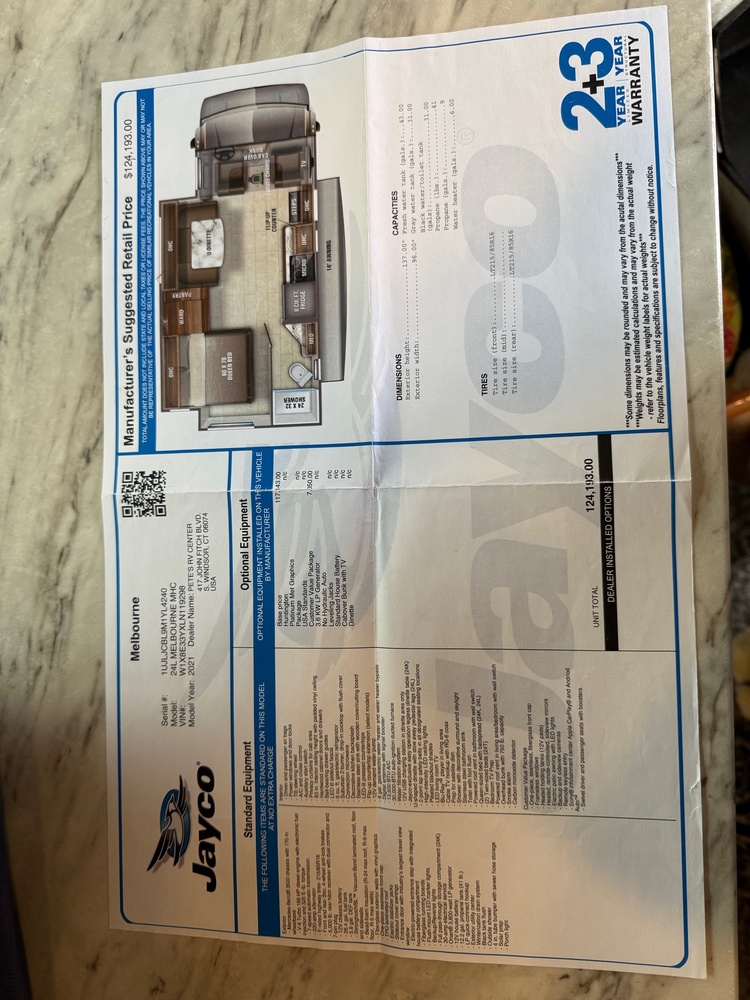 The 2021 Jayco Melbourne 24L is a Class C motorhome that offers both comfort and convenience for your traveling adventures. With 31,000 miles on the odometer, this vehicle is ready to hit the road with you at the wheel. Fresh water: 43 gallons. Grey water: 31 gallons. Black water: 31 gallons. Propane 41 lbs/9 gallons. Water heater: 6 gallons.