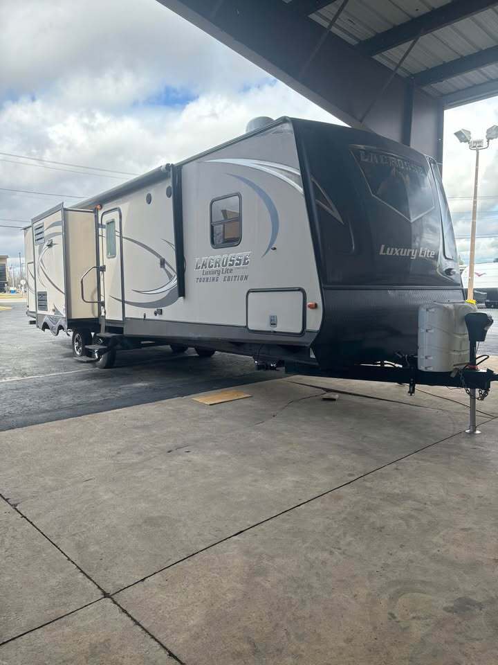 Make memories in our 2014 LaCrosse 329BHT. The 329BHT has a power tongue jack and electric stabilizers, making setup a breeze! Continuing around the outside, you will notice the large outdoor kitchen with a mini refrigerator, two stoves, and a sink.
