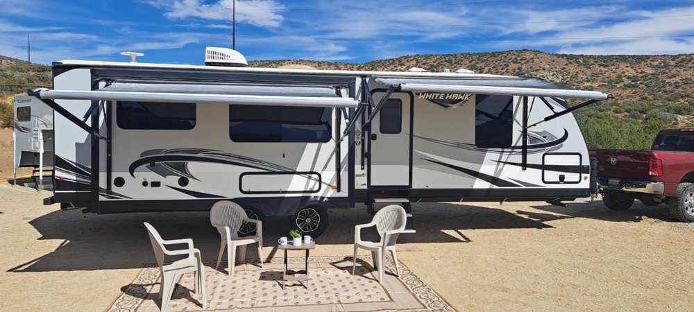 A beautiful Jayco Whitehawk 29ft travel trailer with a glacier insulation package. This 29re model features a spacious kitchen, which includes a food prep peninsula and a food pantry. The dining and entertainment area includes a fireplace, mounted 48" television, DVD/CD player, surround sound system, heated/massaging recliners, sofa and two opposing slides that that expand the living room area. Lots of lighting and a sunroof add to the open concept design. The master bedroom has a queen mattress, closets and overhead reading lights. There is a private bathroom entrance from the master. The Whitehawk sleeps 6, is wired for solar, plenty of USB outlets and has lots of storage space. Registration was recently renewed. Won't last long at this price.