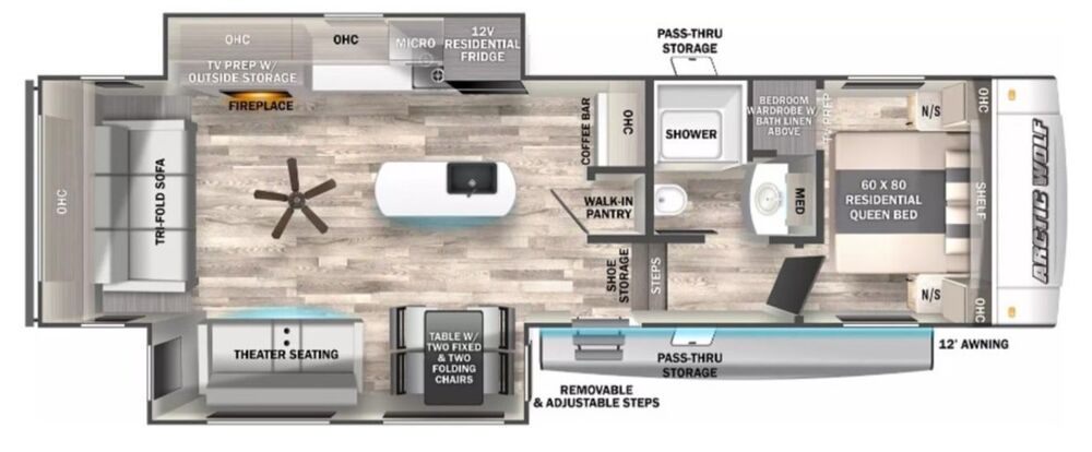 Built with bold style and aerodynamic design, the Cherokee Arctic Wolf is made to impress on the road and at the campsite. It comes solar-ready, featuring a powerful 200-watt rooftop solar system plus an additional 800 watts of portable solar, giving you dependable, sustainable energy for all your off-grid adventures. Stay cool wherever you roam — the included SoftStartRV kit lets your AC run smoothly with a reduced startup load, making it compatible with lower-wattage generators. And when it’s time to relax, the spacious 17-foot power awning creates a shaded outdoor oasis at the push of a button.