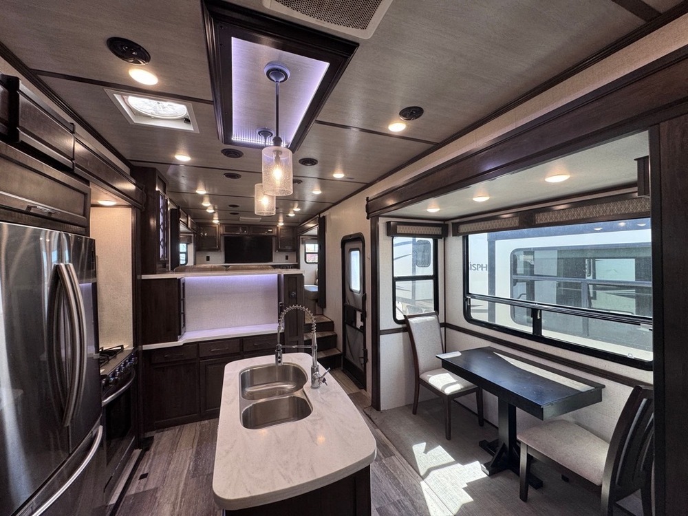 Experience camping as it should be; comfortable and convenient! The kids are sure to love the front living area that will double as their bedroom at night. Here, the fireplace will keep them warm, and they can watch a late-night movie on the LED HDTV. The electric recliner sofas provide plenty of seating space, and the free-standing table with two chairs in the kitchen allow two people to play a game of cards if it's too loud in the living room. Preparing meals each day will be easier than ever with the four burner cooktop and oversized convection microwave, and you can wash dishes in the stainless steel double bowl sink. This model also includes a Samsung French door refrigerator and plenty of cabinet space for all your essentials. The spacious walk-through bath includes dual bath sinks, a shower with a seat, plus a closed off toilet for convenience. You will enjoy many helpful features in this model, including USB charging stations by the night stands, a pull-out laundry hamper, plus five slides for maximum space!