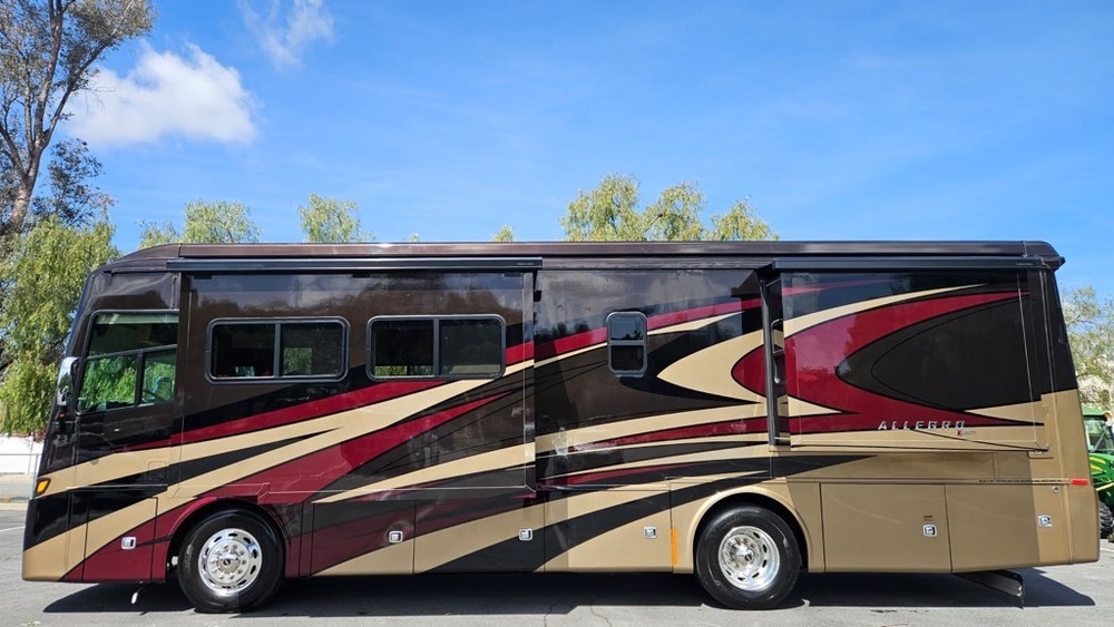 13K miles 360HP Six speed allison transmission automatic hydraulic leveling jack system 8000W generator back up camera and side view cameras power awning Full body paint four Super slide outs outdoor entertainment system lots of basement storage with pull out trays beautiful luxurious spacious floorplan leather interior Full kitchen with stainless steel appliances Corian countertops, full bathroom large master bedroom suite with walk around access bed so many more options too many to list no pets no smoking amazing condition like new inside and out also plumbed for a washer and dryer