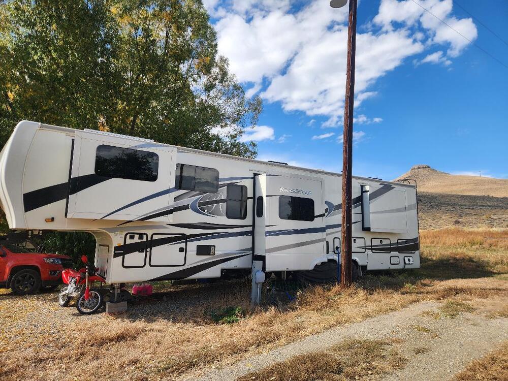 One owner, no pets, kids, or smoking. Riverstone build quality. Rig has seen very little use. Luxury living for 2, with Queen Bed, big shower, huge kitchen, 5 slides, desk, theater chairs, 60" TV, JBL surround sound, electric fireplace, 3 AC units with heat pump, on demand hot water, 5 slide outs, 2 awnings. Garage is 110" deep, 64" wide, and 82" tall, perfect for a small sidexside, golf cart, or a couple motorcycles. Rig has only been towed a few times, less than 2000 miles. Tire covers, AC covers, and a B&W companion hitch included with sale. Priced 15k below Wholesale for a quick sale, we need the cash for a down payment on a house.