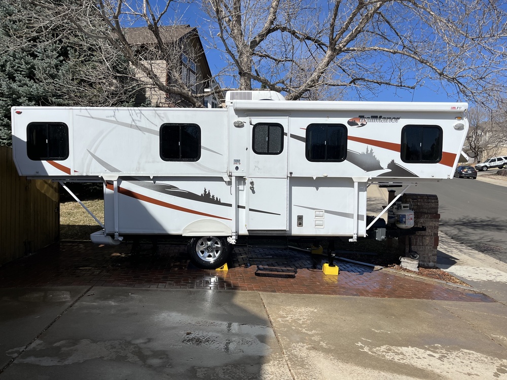 Amenities: 40gal fresh water tank (upgraded option), 30 gal gray water tank, full tub with shower, kitchen dinette with table extension, outdoor shower, cd player with speakers, 20000 btu furnace, ceiling drop AC, oven, 3 burner stove, privacy curtains, two full beds, dinette folds to a 3rd full bed, propane/car plug/or battery select refrigerator, swing release hitch (to park in your garage), tv hookup w/roof antenna, massive patio awning, 4 leveling jacks