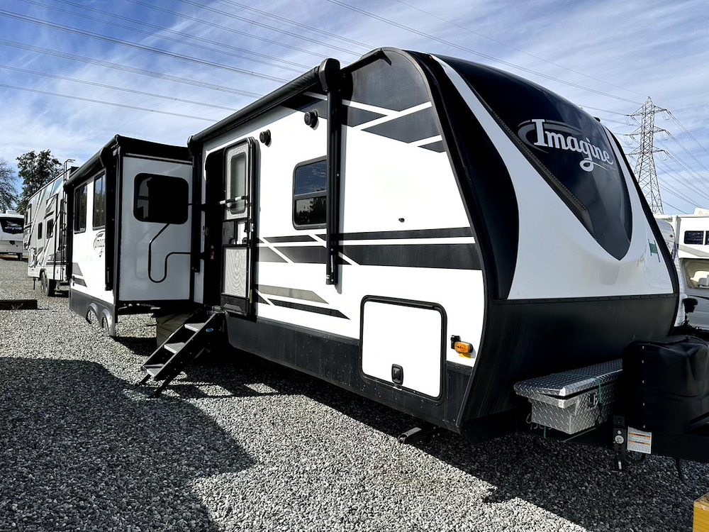 This travel trailer is perfect for a couple. We have taken out the dining table but can be put back in. There is a flip up table on the island and a desk on the slide where the table was. There are four 100 amp hour lithium batteries in the bay that will stay with the trailer along with three solar panels on top. The bay also includes a Moryde tray that pulls out on both sides to make it easier to get to things. The trailer has Goodyear Endurance tires that are G rated. The mattress is new, by Purple. So it is a foam mattress, firm yet gives.