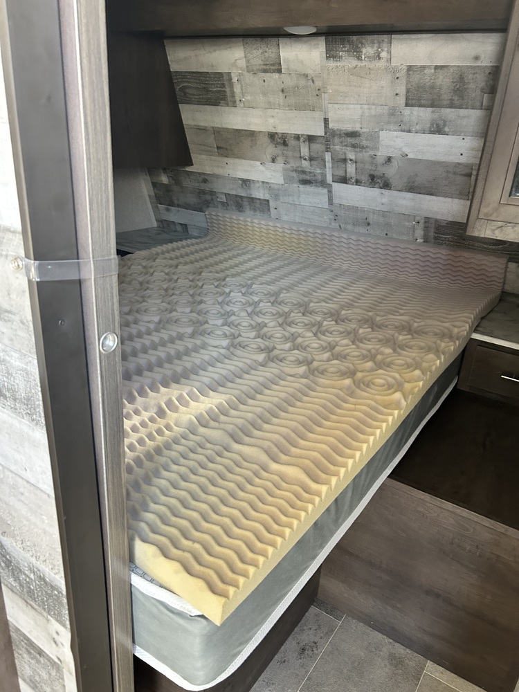 The rear of the trailer features a bunkhouse that is perfect for kids or additional guests, while the master bedroom offers a comfortable queen-sized bed and plenty of storage for all your belongings. The bathroom includes a shower, sink, and toilet, making it easy to freshen up after a long day of outdoor activities.