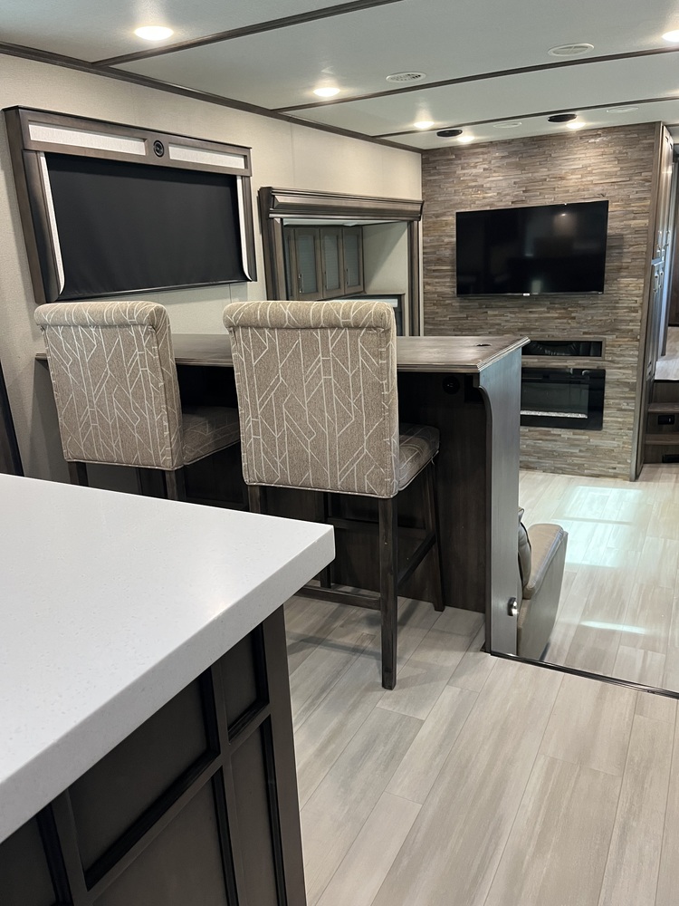 The 2021 Grand Design Solitude 390RK/390RK-R is a luxurious fifth wheel trailer designed for those who appreciate spacious and comfortable living on the road. With only 200 miles on the odometer, this practically brand-new RV is ready for all your adventures. The Grand Design brand is known for its high-quality construction and attention to detail, and the Solitude model is no exception.This particular unit comes in a sleek and modern design, perfect for those who want to travel in style. The exterior features a durable construction with attractive graphics, while the interior is elegantly appointed with all the amenities you need for a comfortable journey. The 390RK/390RK-R floorplan offers plenty of living space, including a spacious rear kitchen with plenty of counter space and storage. The living area is designed for relaxation, with comfortable seating and a cozy fireplace.The bedroom is a peaceful retreat, featuring a king-sized bed and plenty of storage for all your belongings. The bathroom is well-appointed with a shower, sink, and toilet. This trailer is perfect for long trips or full-time living, with all the comforts of home. Whether you're looking to travel solo or with a partner, the Grand Design Solitude 390RK/390RK-R has everything you need for a memorable journey.Overall, this fifth wheel trailer is a top-of-the-line option for those seeking luxury and comfort on the road. With its sleek design, high-quality construction, and ample living space, the Grand Design Solitude is sure to impress even the most discerning RV enthusiast. Don't miss your chance to own this impressive unit and start your next adventure in style.