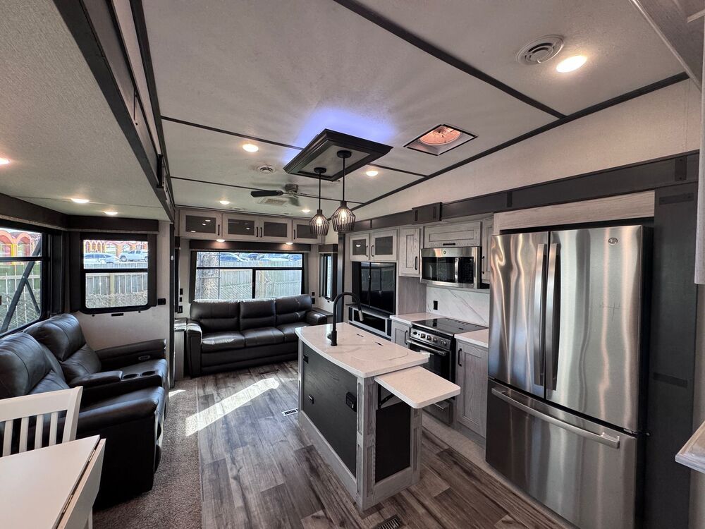 Just one look at this Montana High Country fifth wheel will impress you! There is an extra middle room that can be used for many different purposes, like an office, a guest bedroom, a craft room, or a hangout room. The hide-a-bed sofa sits on a slide for more space in this room, and there is a desk that can be used to get some work done. Above this room is a loft, so you have even more sleeping space. You also have a hide-a-bed sofa in the living area, and the king-size bed in the front private bedroom has storage underneath. The power theater seating sits across from the fireplace and entertainment center for nighttime relaxation, and the kitchen island has a countertop extension for more prep space.