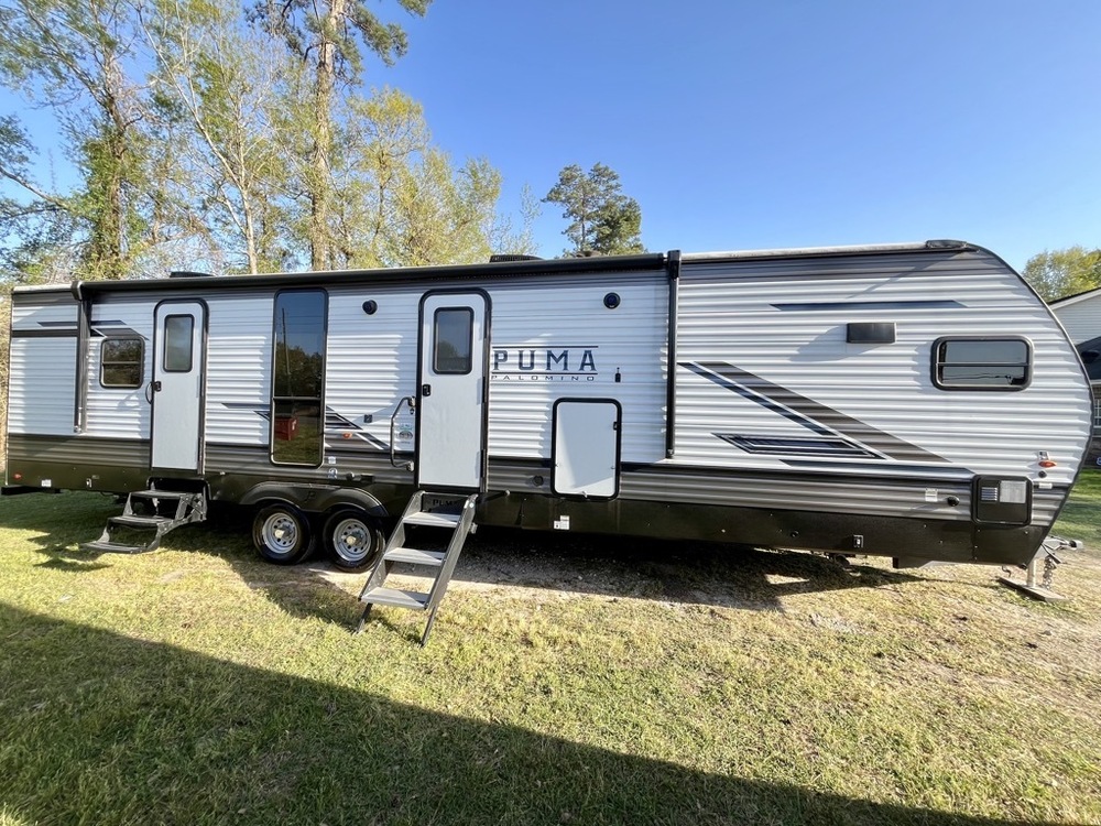 2023 FOREST RIVER PUMA 38ft 2 SLIDES WASHER DRYER READY. 2 AC’s . REAR KING walk around bed . And wardrobe closet with washer, dryer connections private bath with Glass enclosed shower. FRONT KITCHEN center living room area with reclining loveseat and dining table in slide. Across from kitchen . and entertainment center with fireplace and sofa sleeper. full size refrigerator. lots cabinets for storage Full-size pantry. has central AC' 15000 BTU central ac and a second AC in the bedroom and Central heat .50 amp service, 6.5 gal gas/elc water heater with DSI. electric roll out awning with built in LED lights . one owner indoor stored. Only used a few times since purchased New. excellent Condition everything works will demonstrate . Actual photos, clean title $27,900 (832) 253-3336