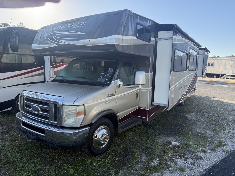 The 2015 Coachmen Leprechaun 319DS is a Class C motorhome with a Ford E450 chassis, featuring dual slides, a U-shaped dinette, and sleeping space for seven, along with features like a fireplace, dual recliners, and hydraulic leveling jacks.