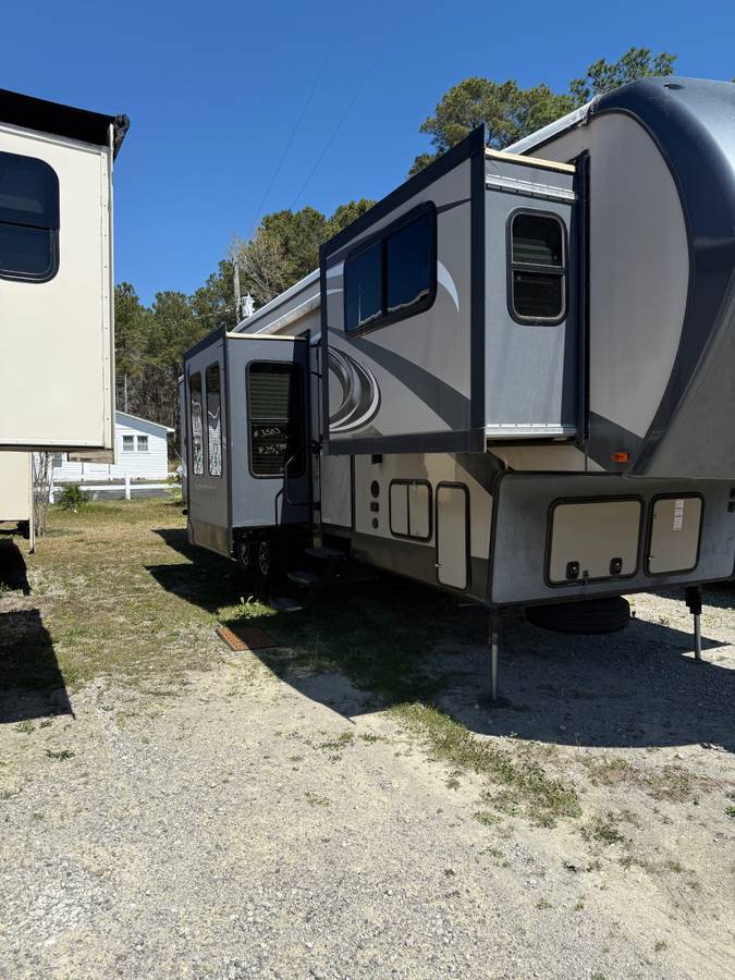 The Sandpiper 377FLIK fifth wheel by Forest River offers a few great features, such as a front living area and a kitchen island.