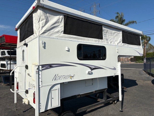 This camper’s lightweight, compact design makes transportation and road maneuverability a breeze. Additional features include an outdoor shower, air conditioning, a new 100w solar system, and a backup camera. Benefit from under-bed storage with gas-filled lift struts and a detachable wrap for added locking storage, perfectly suited for long-bed trucks. Explore the great outdoors with this fully equipped Northstar 850SC—your adventure awaits!