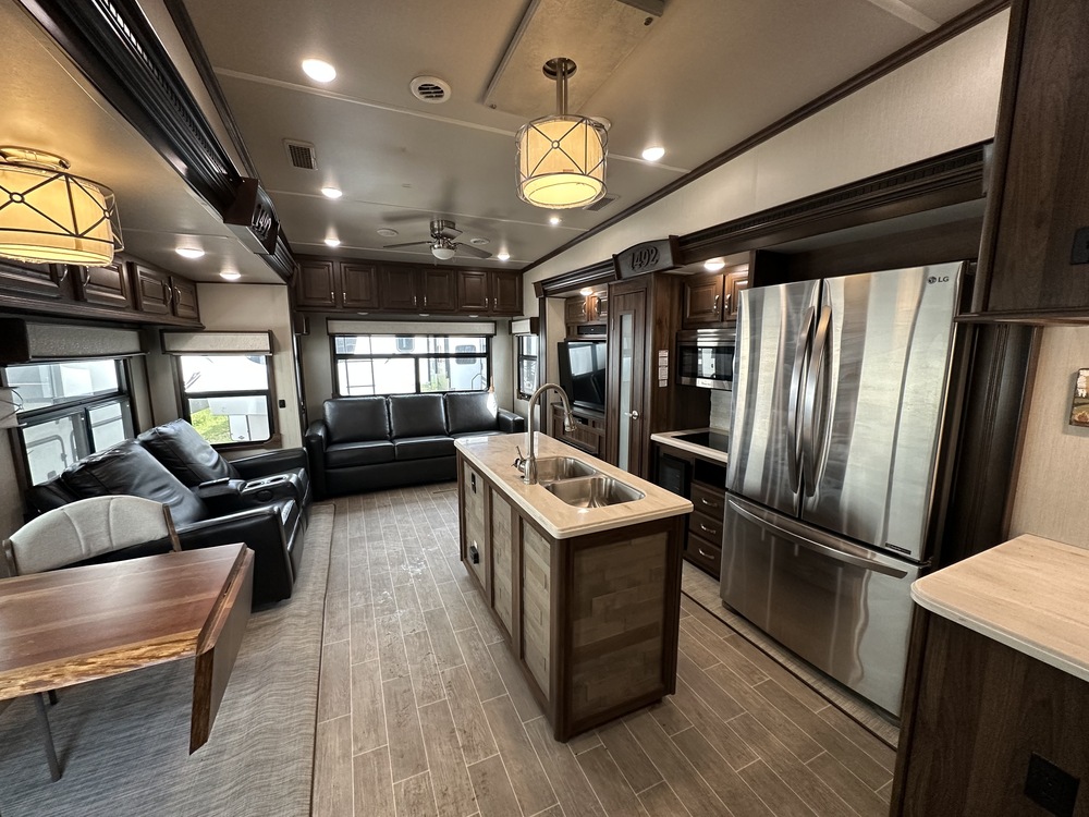 Everyone will stay clean with a bath and a half in this fifth wheel! The kitchen has a pantry big enough for everyone's favorite snacks, a glass top stove, and a kitchen island to prepare your best meals, including a dishwasher for easy after meal clean up! The rear living area offers a comfortable place to watch the big game too with an 88" split tri-fold sofa and 65" power theater seating directly across from the entertainment center with a 50" Smart TV. Two can get ready at once in the front bathroom featuring a vanity with dual sinks, walk in closet and it comes equipped with a washer and dryer!