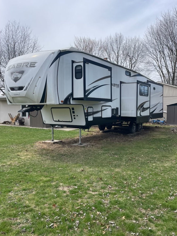 The 2022 Forest River Sabre Cobalt Edition 36BHQ is a luxurious fifth wheel trailer designed for comfort and style. This like new model is ready to hit the road and provide you with countless adventures. The Sabre Cobalt Edition features a spacious interior layout with high-end finishes and amenities that make it feel like a home away from home. The fifth wheel design allows for easy towing and maneuverability, making it perfect for both short weekend getaways and extended road trips. This camper has never hit the campgrounds.