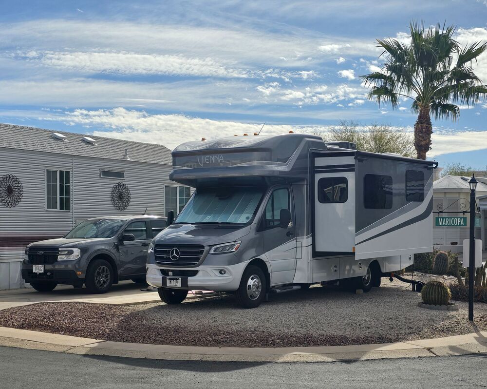 The Mercedes Chassis 3500 chassis gets great mileage and tows up to 4,200 lbs. We have towed our 2024 Ford Maverick to AZ and back and hardly noticed the pickup was behind the RV. On average we get 11-15 mpg depending on wind and notice that the tow vehicle braking hardly ever comes on when stopping. The Mercedes has all the safety features - Active Lane Keeping Assist, Active Distance Assist, Attention Brake and Traffic Sign Assist. Also included is the MBUX™ Multimedia System with 10.25” Touchscreen with Radio, Satellite, Navigation, Apple® Carplay™, and Android® Auto™ Compatible.